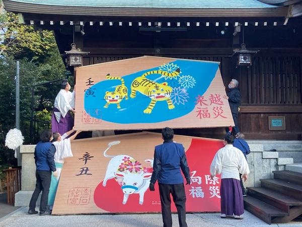 牛から虎へバトンタッチ 遠石八幡宮の大絵馬