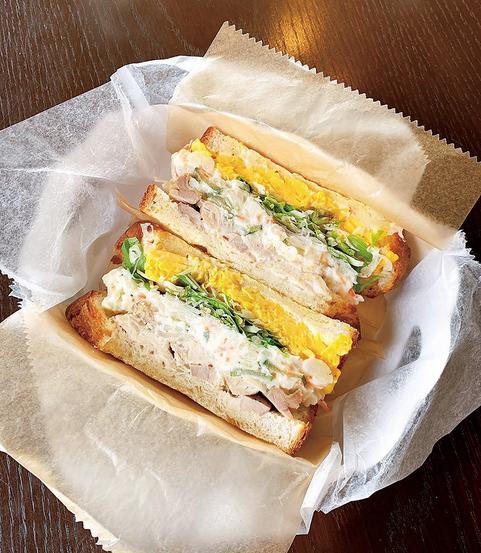 シラナミカフェ たけのさんど 800円 スクランブルエッグ、玉ネギ、鶏肉、周南市の居酒屋「竹の第」の自家製ソース入りポテトサラダを、田布施町の名店「yamag...