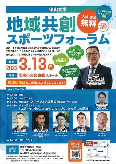山口県周南市の徳山大学地域共創スポーツフォーラムが13日(日)午後1時から市文化会館大ホールで開かれ、びわこ成蹊スポーツ大学学長で元Bリーグチェアマンの大河正...