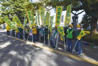 輝きクラブ周南が交通安全活動 市役所前で高校生に呼びかけ