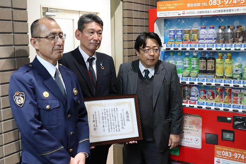 自販機の横に立つ左から山村署長、佐口支店長、鶴理事長