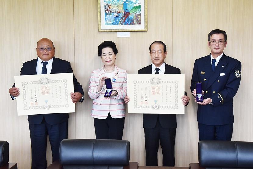 今春の叙勲で瑞宝双光章を受章した元周南市消防本部次長の山本隆さん(68)と、瑞宝単光章を受章した市消防団の分団長、古城隆夫さん(70)が9日、山口県周南市の市...