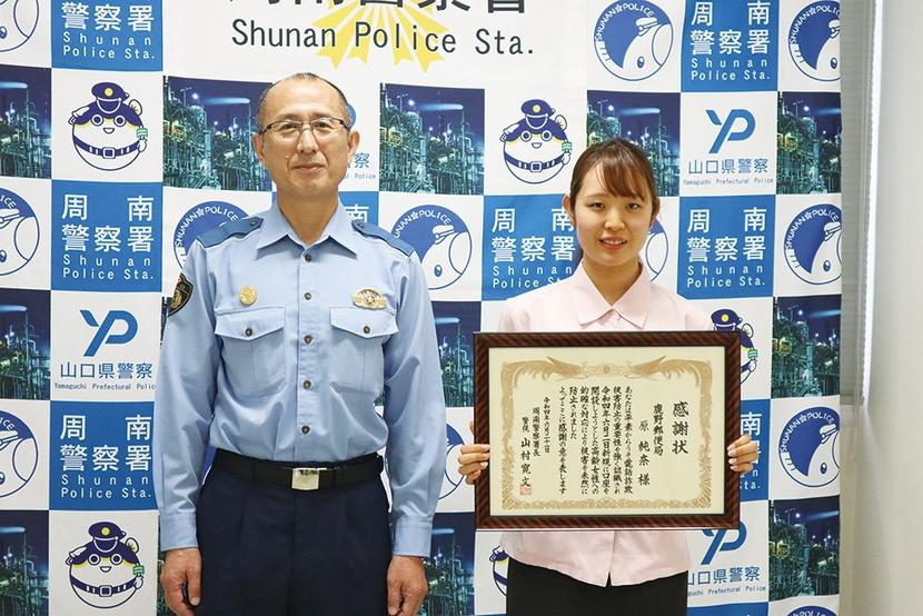 山口県周南市の周南警察署は21日、うそ電話詐欺の被害を未然に防いだ功労で、鹿野郵便局(青木仁局長)に勤める原純奈さん(23)に感謝状を贈った。 原さんは今月...