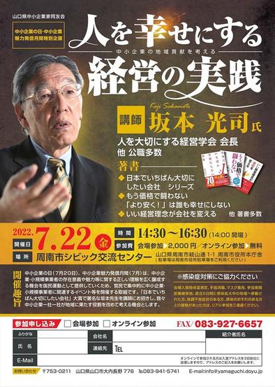 人を大切にする経営学会会長の坂本光司さんの講演会が22日(金)午後2時半から山口県周南市役所のシビック交流センターで開かれる。演題は「人を幸せにする経営の実践...