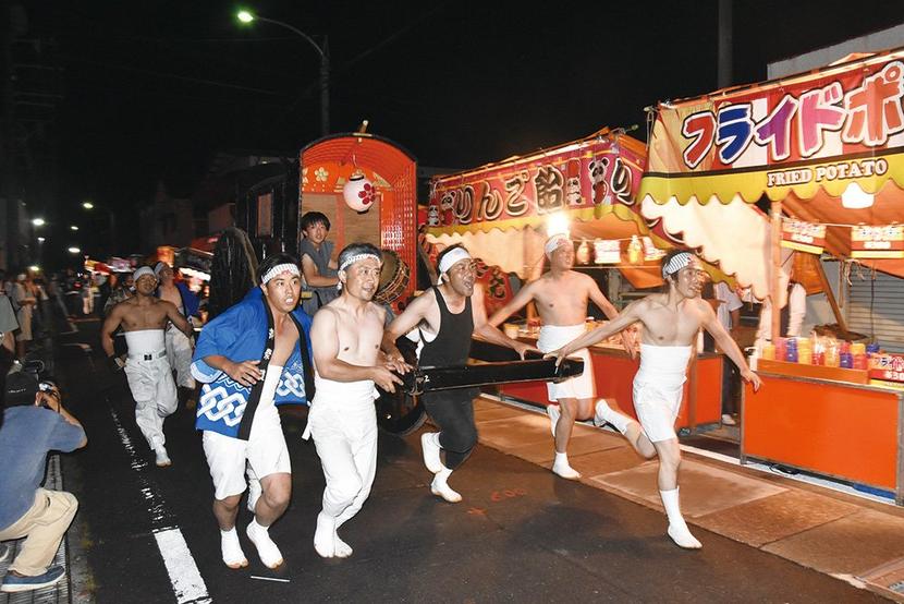 露店が並ぶ山口県周南市鹿野の中心部を7月30日の夜、3年ぶりに網代車が駆け抜けた。旧街道沿いには20軒の露店が並ぶなか、白いさらしを巻いた裸坊が車輪の直径が2...