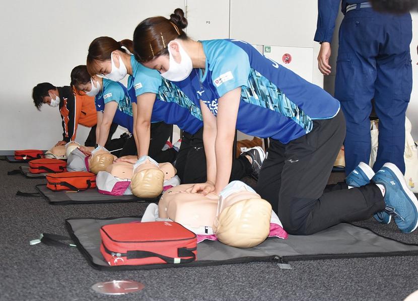 この日は林樂選手(23)▽川島美南選手(24)▽久湊菜々選手(19)が参加。最初にインフォメーションスペースで救急車の呼び方など救急業務をテーマにしたトークイベントがあった。