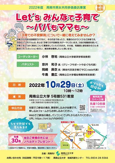 子育ての不安解消について考えるシンポジウムが29日(土)の午前10時から正午まで、山口県周南市の周南公立大学の5号館531教室で開かれる。市と周公大の主催で、...