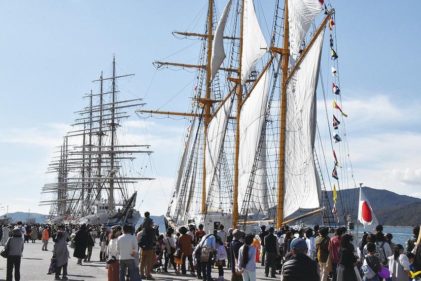 大型帆船の「日本丸」(2,570トン)、「海王丸」(2,556トン)と、「みらいへ」(362トン)が徳山下松港の開港100周年を記念して山口県周南市の晴海ふ頭...