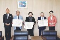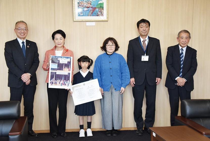 左から厚東教育長、藤井市長、中村さん、薫さん、磯村校長、笹村さん