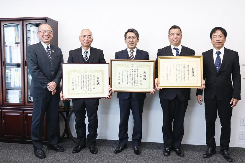 山口県周南市の須磨小(坂井竹俊校長、7人)のPTA(廣實力会長)が優良PTAとして文部科学大臣表彰、県PTA連合会前理事の中野譲さん(49)と住吉中(西村康成校長、189人)のPTA(小西智宏会長)が日本PTA会長表彰を受賞し、13日に廣實会長(45)、坂井校長(52)、中野さん、西村校長(56)が市役所で厚東和彦教育長(62)に受賞を報告した。