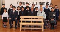 [山口県東部森林組合]光市に木製ベンチ3脚 塩田小で全児童参加し寄贈式
