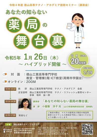 山口県周南市の徳山高専ICT教室で26日(木)午後3時から5時まで、県薬剤師会の小屋敷淳子副会長による「あなたの知らない薬局の舞台裏」と題した講演会が開かれる...