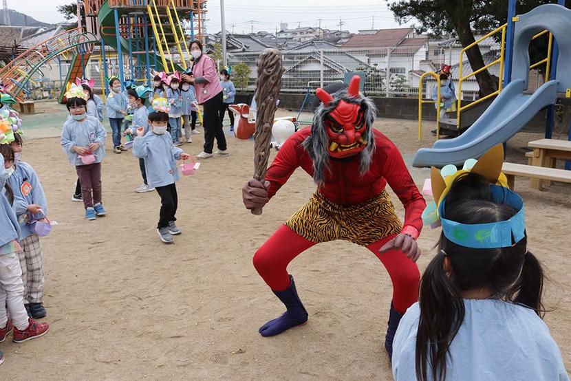 節分の日の3日、山口県周南市内の幼稚園、保育園に鬼が現れた。園児たちは果敢に声を上げながら豆をなげ、最後には鬼と踊るなどして大いに楽しんだ。 この取り組みは...