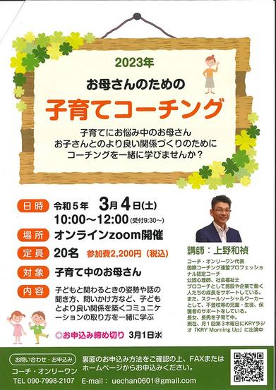 山口県周南市戸田のコーチ・オンリーワン代表、上野和禎さん(49)が3月4日(土)の午前10時から正午まで、オンラインによる「お母さんのための子育てコーチング」...