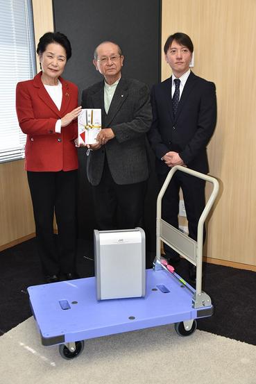 左から藤井市長、深町会長、山本さんと贈られたアンプ、台車