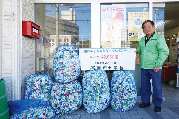 山口県周南市の富田西小は2月16日、ワクチンに交換するため児童が収集した使用済みのペットボトルキャップ4万2850個を新南陽若山ライオンズクラブ(三戸保志会長...