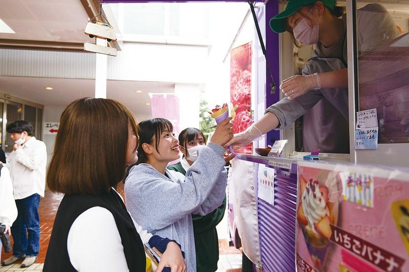 主催は空き家活用や子ども食堂の運営などに取り組む同大起業部「ゼブラクラブ」で、1年生に食で楽しんでもらい歓迎したいと企画。地元企業の協力で実現し、キッチンカーは特製トマトミートパスタの「tutto」▽「たこ焼きstandカギ印」▽チキンバターカレーの「プラナーム」▽クレープの「フルッタ」▽チュロスの「ソフクルキッチン」▽ガパオライスの「DESSERTⅢ」の6店が出店した。
