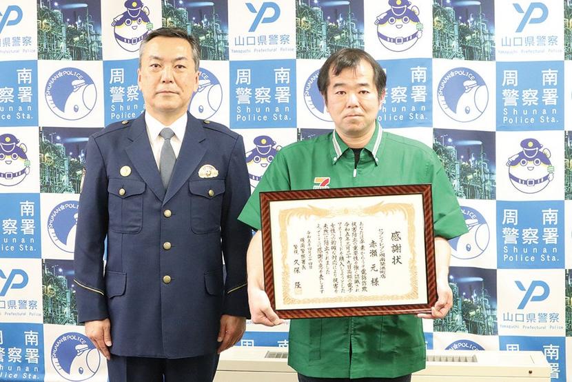 周南市の周南警察署(久保隆署長)は24日、うそ電話詐欺の被害を防いだとして、同市のセブンイレブン周南築港町店の店員、赤瀬元さん(48)に感謝状を贈った。 赤...