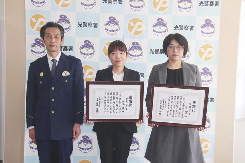 光警察署(進藤常範署長)は8日、うそ電話詐欺の被害を防いだ光市浅江の西京銀行虹ケ浜支店の佐々井慧佳(さとか)係長(31)と行員の山中和美さん(51)に感謝状を...