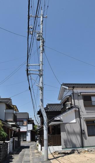 周南市の櫛ケ浜の街中に、途中から道路側にせり出すように曲がった電柱があり、話題になっている。