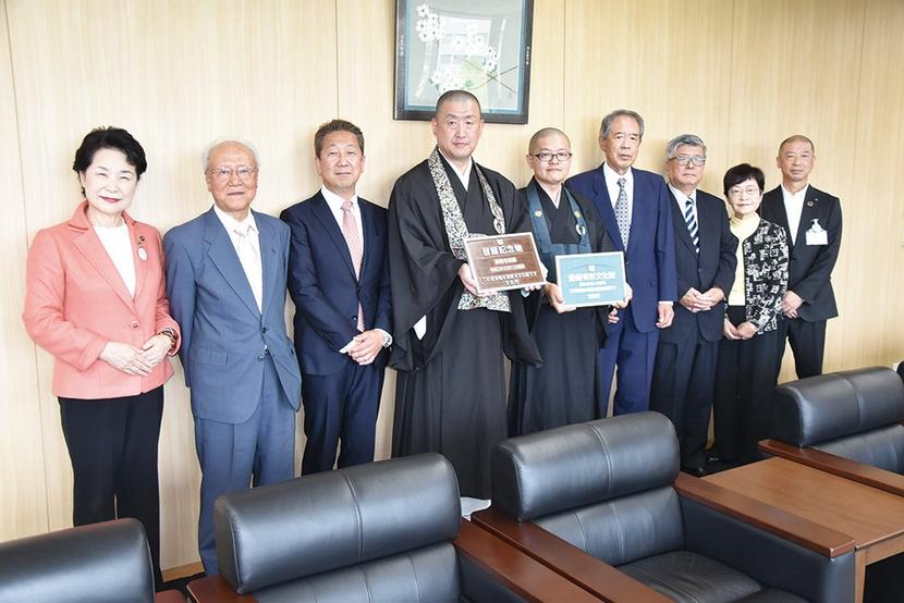 山口県周南市鹿野の漢陽寺(杉村宗一十住職)の庭園が登録記念物、川崎の川崎観音堂(河村史紀住職)の本堂、山門、門柱が登録有形文化財であることを示すプレートが文化...