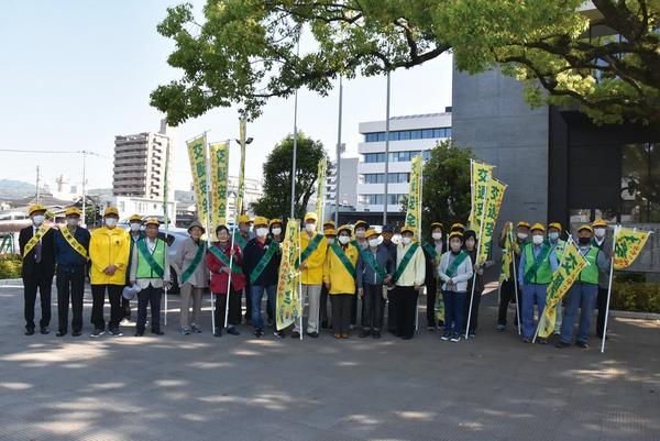 春の交通安全運動が始まった11日朝、山口県周南市老人クラブ連合会・輝きクラブ周南(岸村敬士会長)の徳山地区の見守り委員会の29人が、市役所前の交差点で「交通安...