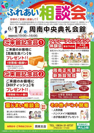 山口県周南市周陽の周南中央典礼会館が17日(土)午前10時から午後4時まで、ハンドメイド雑貨の販売やフラワーアレンジメント体験ができる「ふれあい相談会」を開催...