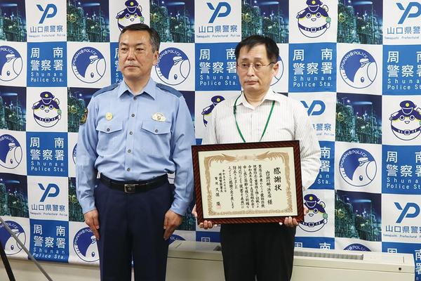 山口県警周南警察署(久保隆署長)は6日、うそ電話詐欺の被害を防いだ周南市櫛ヶ浜の山口銀行櫛ケ浜支店(海田宏顕支店長)の藤井義徳支店長代理と行員の久保麻美子さん...