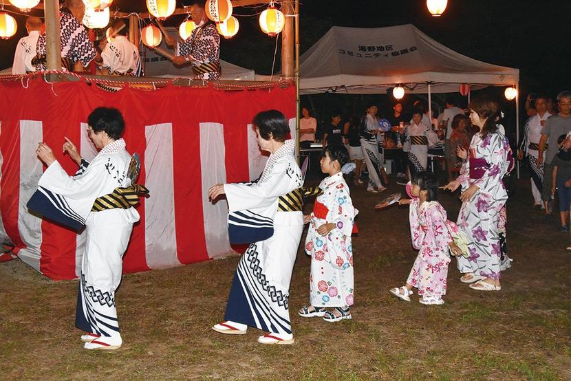 そろいの浴衣や法被の会員を中心に、子どもたちや住民も加わり、威勢の良い大太鼓と、会場に広がる口説きの声に合わせ、独特の足さばきの踊りの輪が広がっていた。