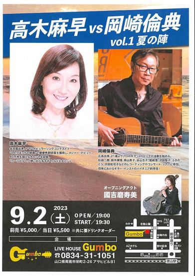 【周南市】髙木麻早VS岡崎倫典ライブ 9月2日・Gumbo