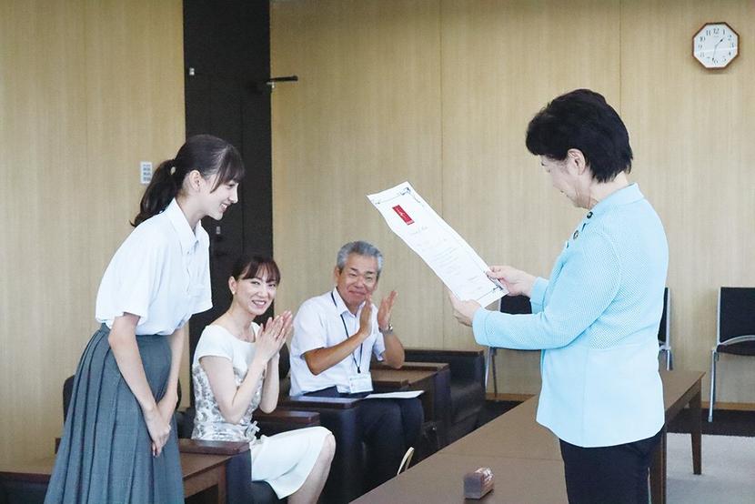 藤井市長は拍手でジュリアさんを迎えると「これからもっと花開いてください」と励ました。