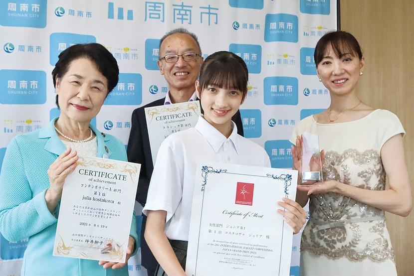 地域周南市山口県周南市の岐陽中(魚谷裕司校長)2年のコスタコフ・ジュリアさん(13)が24日に同市役所を訪問、国際バレエコンクール・ジャパングランプリのジュニアB―Ⅰ部門で優勝したことを藤井律子市長に報告した。