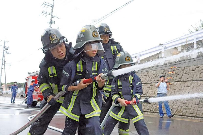 実際に現場に出動する消防車に乗り、放水も体験。「楽しい」や「難しい」など反応は様々だった。