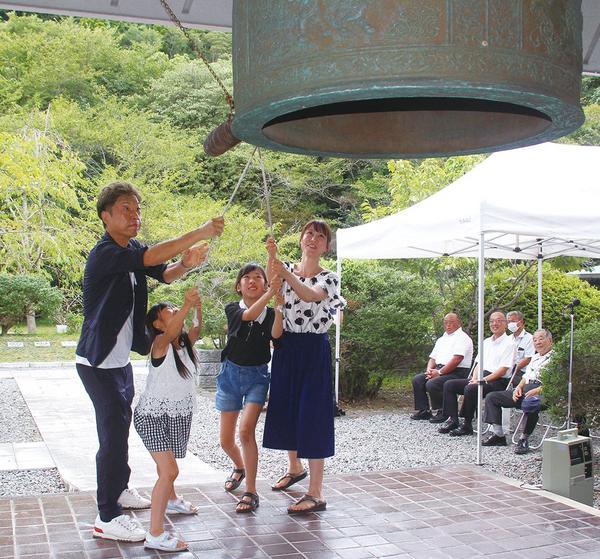 山口県周南市の徳山ユネスコ協会(原田茂会長)の「平和の鐘を鳴らそう」が終戦の日の15日、大津島の回天記念館で開かれ、参列した85人全員が同館の前庭にある「平和...