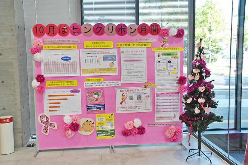 10月は乳がんの早期発見などを呼び掛けるピンクリボン月間。周南市は市役所1階のロビーにピンク色の啓発展示を設置し、新南陽駅前では10月末まで新南陽商工会議所女...
