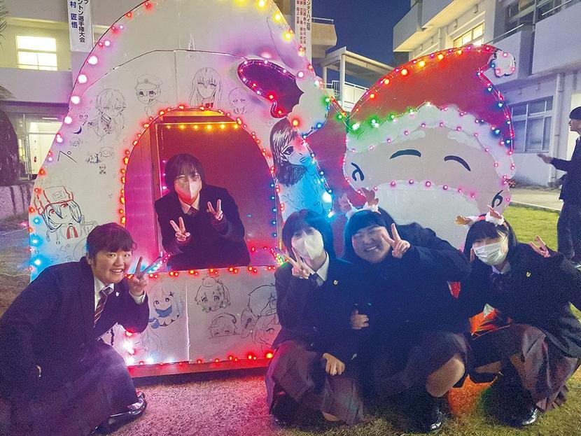 周南市の山口県桜ケ丘高(熊安洋校長)で17日、アーティストコース美術専攻の1年が制作したイルミネーションの点灯式が開かれた。 点灯式は2018年から開かれて...