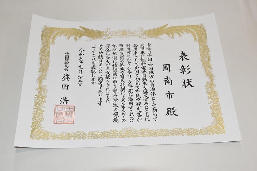 周南市が中・四国の自治体で最初に水素で動く燃料電池自動車(FCV)を公用車として導入するなど環境保全の功労者として22日、国土交通省中国運輸局長表彰を受賞した...