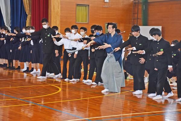 周南市の秋月中(秋本泰宏校長、146人)で21日、「能楽体験学習」が開かれ、全校生が伝統芸能の能の演目「船弁慶」の演技などを体験した。同様の学習は22日に富田...
