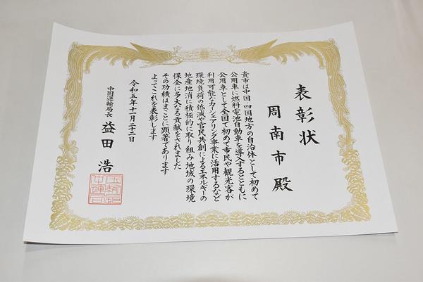 【周南】水素自動車活用で運輸局長表彰 環境保全へ、カーシェアリングも