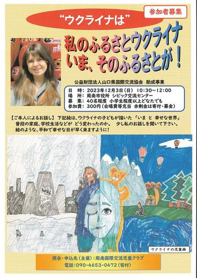 ウクライナ出身で現在下松市に住む古谷ニーナさんの講話が3日(日)午前10時半から正午まで、周南市役所シビック交流センターで開かれる。 テーマは「私のふるさと...