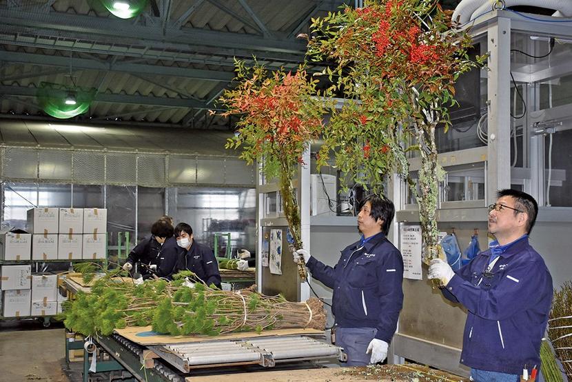 周南市鼓海の地方卸売市場花き市場で12日、縁起が良いことから正月飾りに使われる常緑の松や赤い実の千両などを扱う「松市・千両市」が開かれ、威勢のいい競りの声が場...