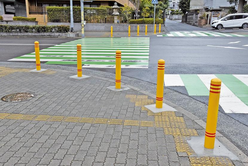 通学路の安全対策に力を入れている周南市は、横断歩道を渡ろうとする子どもに車が突っ込む事故を防ぐため、市道の交差点の横断歩道のそばに車止めの金属製のポールを建て...