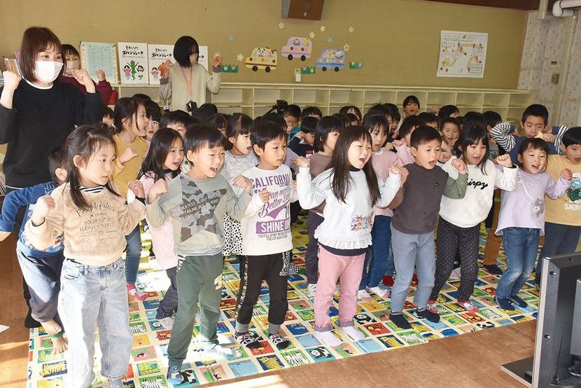山口県周南市の保育園、こども園(公立12園、私立12園、840人)の園児と保育士がインターネットのオンライン会議のZoomを通して県立大学の学生から朝ごはんの...