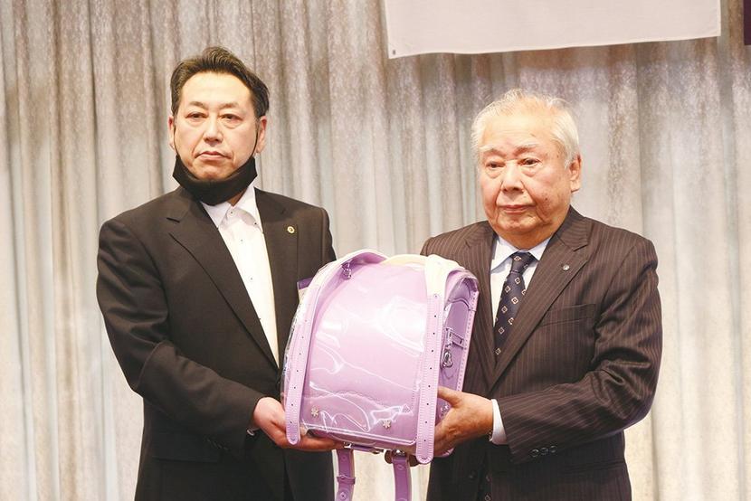 ランドセルを手渡す菅野会長(左)と佐原会長