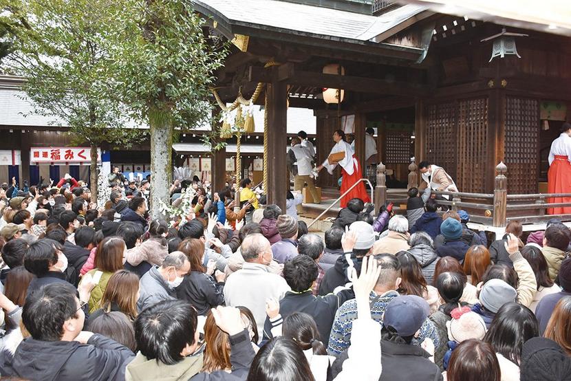 豆・餅まきに集まった人たち=山﨑八幡宮