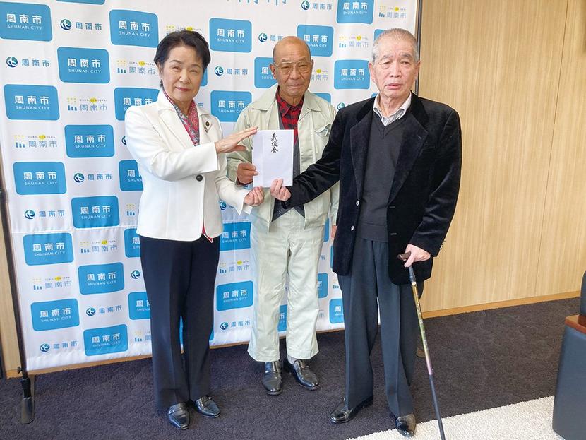山口県周南市住崎町の榮壽汽船㈲の高松満明社長と県釣り団体協議会の岡村晴義会長は6日、市役所を訪れ、同社から30万円と高松社長、岡村会長からそれぞれ10万円ずつ...