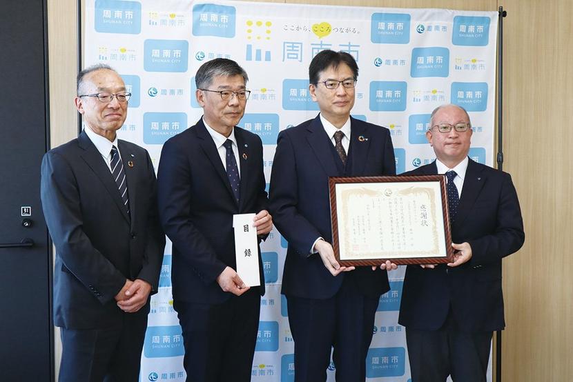 この日は徳山製造所の奥野康所長と徳田晴宣副所長、道源敏治副市長と厚東和彦教員長が出席し、奥野所長が道源副市長に目録を手渡した。奥野所長は「本を読むことを一つのきっかけにしていろんなことに関心を持って成長してもらえたら」と話した。
