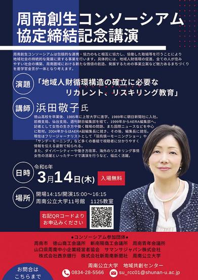 地域周南市山口県周南市の周南公立大の周南創生コンソーシアムに周南市が加盟することになり、14日(木)午後2時から同大で調印式と3時から一般公開の記念講演会が開かれる。記念講演の講師は雑誌の「AERA」元編集長の浜田敬子さん。「地域人財循環構造の確立に必要なリカレント、リスキリング教育」の演題で話す。