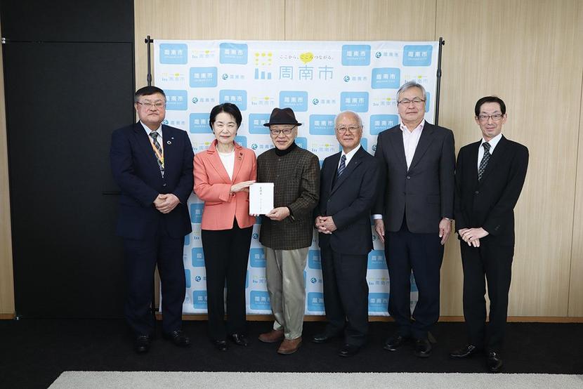 左から松岡部長、藤井市長、柳、林、田坂、田中代表幹事