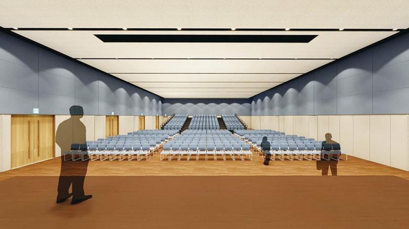 コンベンションホールの設置は市と徳山商工会議所の要望によるもの。最大800人を収容できる多目的ホールとして、企業や団体による各種学会や会議、セミナー、学校のイベントでの活用が見込まれる。延床面積は約550平方メートルで2分割可能。ロールバックチェア方式の500席を備える。50台分の駐車場も確保する。